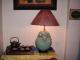 -The body vase is made of porcelain with white and blue enamel. The natural scene, flowers and birds are drawn on body. The support is black-painted wooden. Shade is made red canvas. This table lamp suits old space in buildings with antique architecture. It will bring a peaceful feeling and it makes you think you are living in the past.