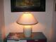 -It is made of porcelain with polished white enamel. Shade is made of white canvas and decorated with a line of black small flowers at the top and at the bottom. A small table lamp suit to decorate a reading table or put on a table in the living room.
